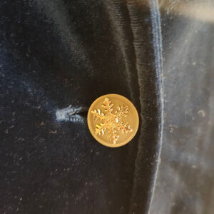 This is a pre-owned Notations women's blazer in teal velvet, size M. It features a single-button closure with a white frosted button with a snowflake embellishment and a notched lapel collar. The fabric content is 90% polyester and 10% spandex, made in Indonesia. The blazer has long sleeves and a straight hemline. No visible signs of wear