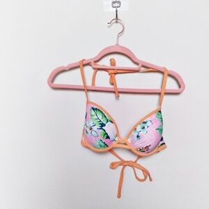 Aerie Brooke pink, orange, and green tropical floral multicolored push up halter style padded triangle self tie bikini top