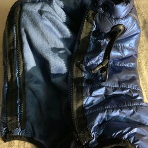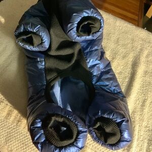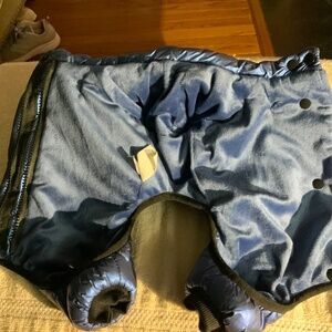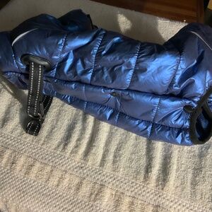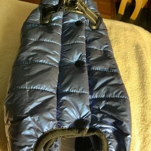 This metallic blue puffy jumpsuit coat is designed specifically for small dogs like Chihuahuas. The fleece lining provides warmth and comfort during the winter season, making it an ideal choice for pet owners looking to keep their furry friends cozy and stylish. The vibrant blue color and metal theme add a trendy touch to the outfit, making it a fashionable choice for pet accessories.