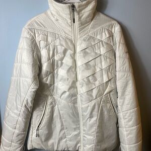 Columbia Omni Heat thermal comfort white puffer jacket. Size Large. Omni Heat interior lining consisting of metallic dot pattern to retain heat while breathable fabric dissipates moisture. Faux fur collar. Adjustable zip high collar. 2 outside zip pockets. 1 interior security zip pocket. Comfort cuffs. Waterproof outer shell. Lightweight but perfect for winter. Shell 100% polyester, cuffs 92% polyester 8% elastane, lining 100% polyester, insulation 50% polyester 50% recycled polyester. Very clean, Excellent condition, Omni-heat tag is peeling.