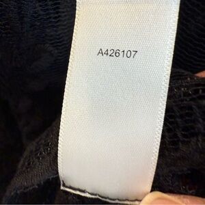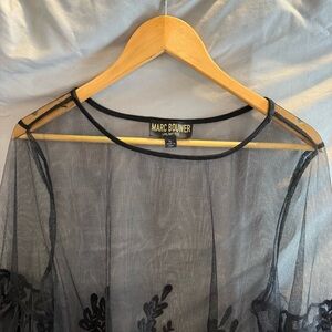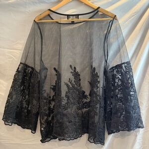 Chic sheer black lace blouse by Marc Bouwer. Features floral embroidery and flared sleeves. Perfect for elegant occasions. Pre-owned. Great condition.