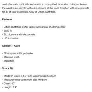 The jacket features a faux shearling collar for added warmth and style. Puffer jacket from UO with a cozy and plush faux shearling collar. This everyday coat offers a boxy fit silhouette with a cozy quilted fabrication. Hits just below the waist in an easy fit with a zip closure at the front. Finished with side pockets for all of your essentials.