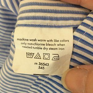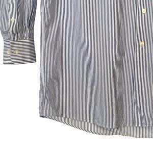 Mens blue and white pin striped dress shirt. Collar, button front, long sleeves with 2 button cuffs.