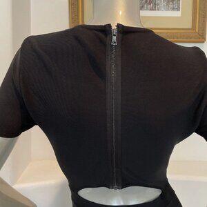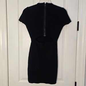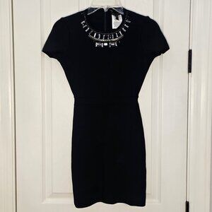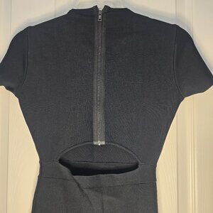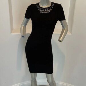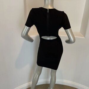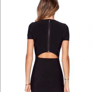 Brand new with tags!! Sleek and stunning bodycon dress that features a crystal embellished neckline and peekaboo back. Crafted from a structured stretch fabric that hugs your curves and acts as a built in spanx. This dress balances elegance and edge perfectly.