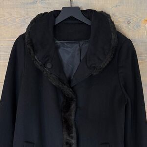 Vintage overcoat. Black wool blend flannel material. Faux fur trim. Snap front. Lower hand pockets. Fully lined.