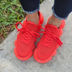 Women Knitted Stylish Bubble Textured Lace up Sneakers Red Color