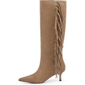 These women's knee-high fringe boots feature a pointed toe and 2.28 inch/5.8cm kitten heels. This modern and elegantly sexy design is suitable for all-day wear.