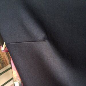 The sheer cardigan or kimono is the prominent feature of the outfit. It is a lightweight, open-front garment with a fluid, draping silhouette.The fabric of the shell appears to be chiffon while the interior black tank top is 100% polyester. The tunic also has darting at the breast level to enhance its form fit. The design of the kimono style cardigan has an abstract pattern with shades of pink, yellow, and black. The Pit to Pit measures 20 inches.