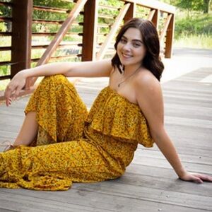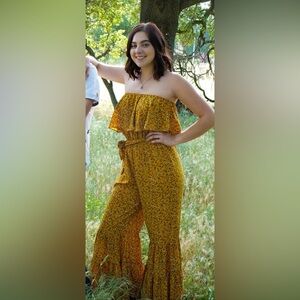 Umgee Mustard Yellow Off Shoulder Ruffled Floral Jumpsuit, Women’s Sz S