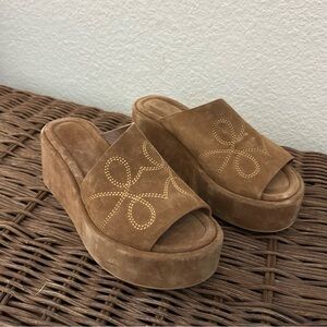 Level up every look with these effortless platform slides featured in a soft suede fabrication with defined embroidery at top for an added special touch.
