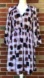 Feminine and flirty! Shades of navy blue, brown and purple squares cover a white backdrop. Features a ruffled neckline and waistline, along with split sleeves at each cuff. Super lightweight. Concealed rear zipper and hook and eye closure. Only the bottom half is lined.