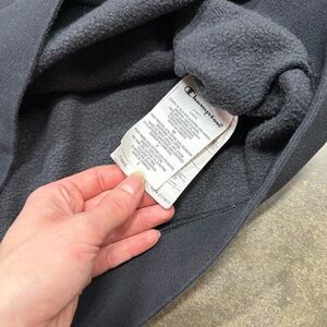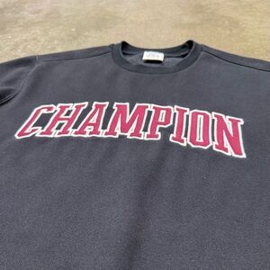 Vintage Champion crewneck sweatshirt. Black with raised stitched (tackle twill) “CHAMPION” script across the chest and small embroidered “C” logo on sleeve. Men’s size Small.