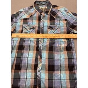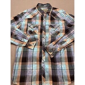The BKE Buckle Shirt for men in size medium is a vintage-inspired western pearl snap shirt with a collared neckline and long sleeves. Made from a cotton blend fabric, this button-up shirt features a spread collar style, embroidered accents, and a classic multicolor plaid pattern. Perfect for various occasions including casual, workwear, and parties, this shirt has a regular fit and is machine washable for easy care. With a chest size of 42 inches, this BKE Vintage Standard Fit shirt adds a touch of cowboy flair to any wardrobe.