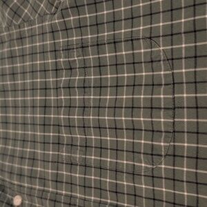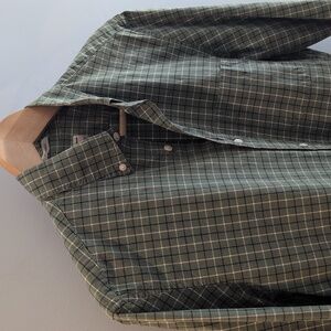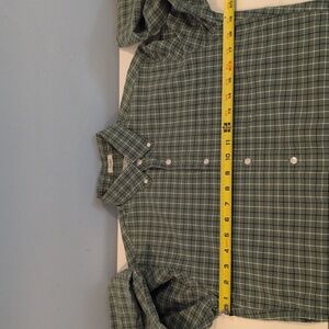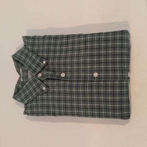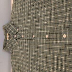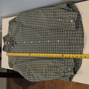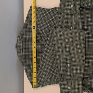 J. Crew Men's Small Classic Fit Stretch Long Sleeve Button Down Shirt Style #H9627. 98% cotton, 2% elastane. Classic fit. Button down collar. Single chest pocket. Green, dark navy and white plaid. Shirt is in excellent used condition. Please see photos for measurements and details.