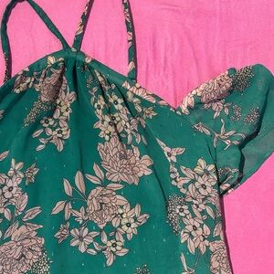Stylish teal blouse with floral pattern. Features off-shoulder and halter design. Ideal for a fashionable look.