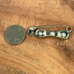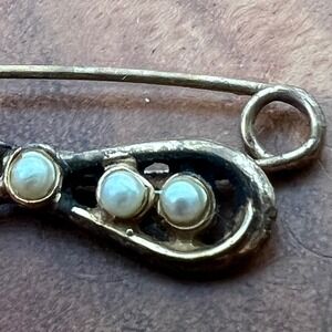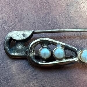 Keywords: safety pin, brooch, bow, pearl accent, vintage jewelry, silver tone, pin accessory, statement pin, unique jewelry, decorative pin, antique style, fashion accessory, gift idea