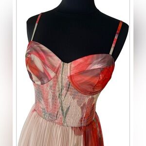 The Hutch Brianna Maxi Dress features a bustier top with a smocked waist, adjustable straps, and flowing pleated tulle for an elegant, romantic look