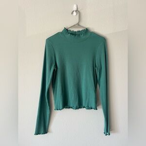 Teal ribbed knit top with long sleeves. Ideal for layering.