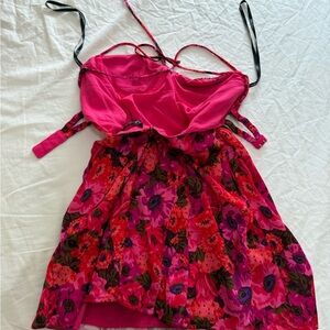 Chic dress with pink and red floral pattern. Strappy design with elegant fit.
