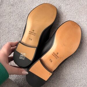 Elegant black leather loafers by Gucci. Features signature green and red stripe. Stylish and comfortable.