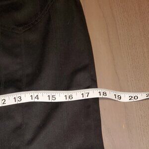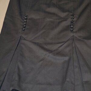 Black stretchy pencil skirt features back interest with two kick pleats, buttons, and buckle detail. Side zipper. 68% polyester, 28% viscose, 4% spandex. Size 0.