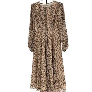Mikael Aghal Beige Polyester Floral Tie Neck Dress Size 4: neckline ties covered in a blooming floral print, long sleeves, elasticized cuffs, back zip closure, lined, measurements: 17.5 inch bust x 43.5 inch length.