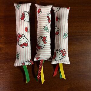 Your fur babies need Christmas presents too! Set of three handmade catnip “kickers.” Approx. 7” long ( not including ribbons) these cat toys are made with cotton and cotton blend fabrics, poly stuffing, and organic catnip. Store unused kickers in a ziplock bag to keep fresh.