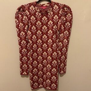 Stylish dress with bold red and cream pattern. Features long sleeves and a fitted silhouette. Perfect for any occasion.