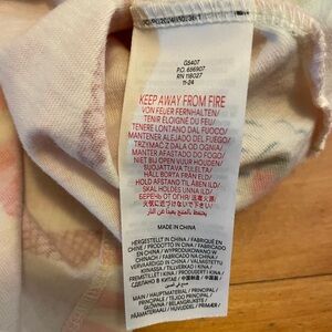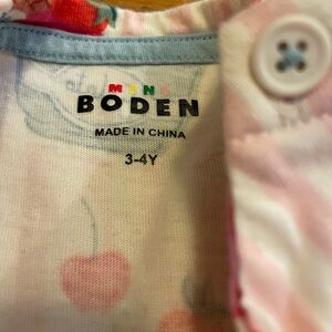 Size 3/4. Short sleeved tunic in pink and white stripes with ice cream print. Front heart pockets. Shoulder button closure. 100% cotton. Very good preowned condition.