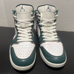 Elevate your look with these Jordan high-tops. White and teal design. Iconic style and comfort.