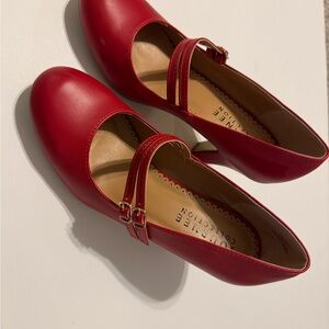 Elegant red Mary Jane heels with a classic buckle design. Perfect for adding a pop of color to any outfit. Worn once, one small mark shown in picture.