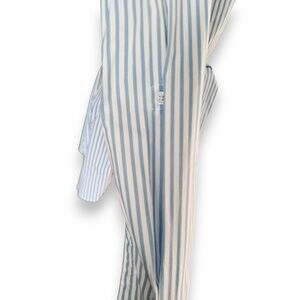 Tommy Hilfiger blue and white striped tunic shirt in size L/G featuring a lightweight cotton blend, partial button placket, long sleeves with button cuffs, and an adjustable self-tie waist for a flattering fit. New without tags; original spare button bag is still attached inside. PTP 20”, length 28”.