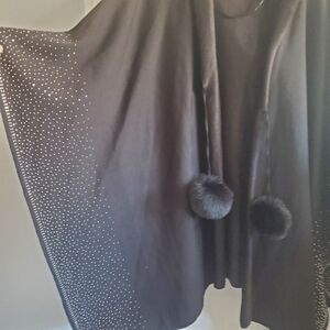 Marc New York Andrew Marc Embellished Shawl Cape w/ hood pom pom OS Evening Cozy