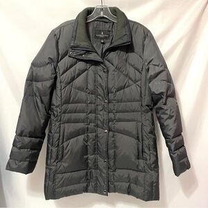 Perfect size black leather shoulder bag. Features sturdy straps and secure zip pockets. Great for everyday use. Measurements in photos!