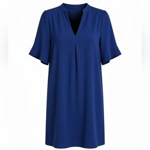 This relaxed blue tunic features a flattering V-neckline and short sleeves, offering a comfortable and versatile style. Its boxy silhouette makes it a perfect choice for both casual and refined looks. The solid color enhances its clean and streamlined appearance, making it a standout piece in any wardrobe.