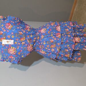 Ro's Garden floral, blue tiered minidress made of 100% cotton with bold, vibrant floral patterns. Perfect for any occasion. there is an elasticized waist and no pockets on this dress. Please see measurements in the photos.