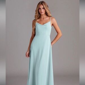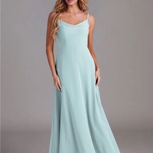 This elegant light blue maxi dress is perfect for any occasion. Its flowing design and soft color make it a versatile addition to your wardrobe. Looks more baby blue in person! Refer to the last picture for color reference.