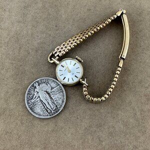 Vintage 1950’s Hamilton 17-jewel hand-wind movement, model 856173, with a 10K gold-filled (RGP) white dial, gold hands, and raised accents. It measures 11/16 of an inch in diameter, features tapered post lugs, a stainless steel back, and a rare Kesler 0.25 gold content mark (1930–40 early gold-filled mark, equivalent to 1/40th today). The 0.33-inch-wide mesh strap adds to its charm. This Hamilton watch runs well, keeps accurate time, and is in better-than-good condition. See pictures for details; fits up to size 6.25.