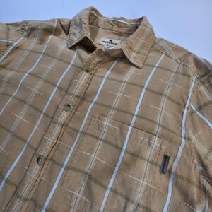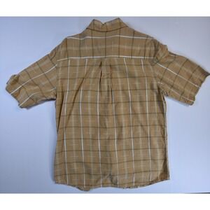 The Woolrich Men's Brown Plaid Short Sleeve Button Up Casual Shirt in size medium is a versatile and stylish piece for men's casual wardrobe. Made from high-quality fabric, this shirt features a classic collared neckline, button closure, and a regular fit, making it suitable for travel, casual outings, and everyday wear. The brown plaid pattern adds a touch of sophistication, while the yellow accents brighten up the overall look, making it perfect for summer, fall, and spring seasons. With its brand reputation and quality construction, this shirt is a great addition to any man's wardrobe.