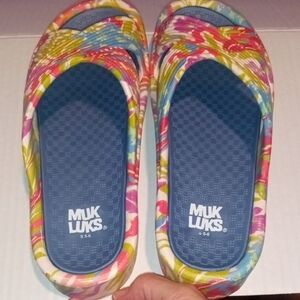 Classic Muk Luks slides in a swirly colorful patter, perfect for the pool, lake or beach and even as everyday slippers for around the house!!