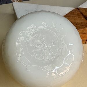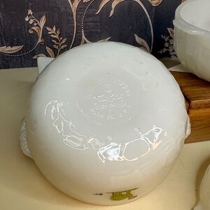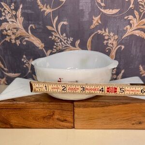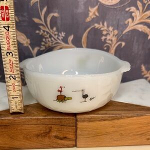 This vintage set of 3 round white Anchor Hocking Fire King bowls features a nostalgic design inspired by BC Comics and Johnny Hart's dinosaur characters. Made of milk glass in the United States between 1970-1979, these limited edition bowls are perfect for all occasions and can be added to any collection. With a mid-century modern style and decorative stackable design, these bowls are a charming addition to any home decor.