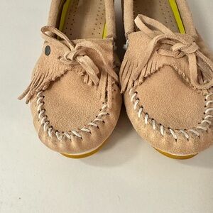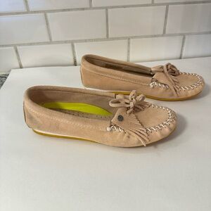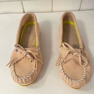 MINNETONKA 9.5 Pink woman suede leather flat fringe bow loafer moccasin comfort