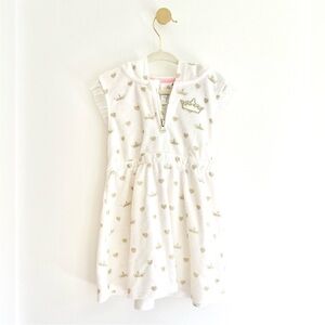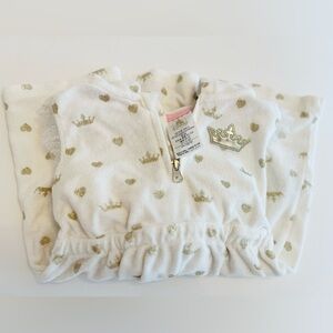 ADORABLE Disney 3T terrycloth swim cover up with shimmering gold hearts & princess crown patterns throughout. Features a cute crown detail, tulle flutter sleeves with glitter accents, quarter zipper, and hood for coverage. UPF 50+ built-in UV protection for safer fun in the sun! So pretty!