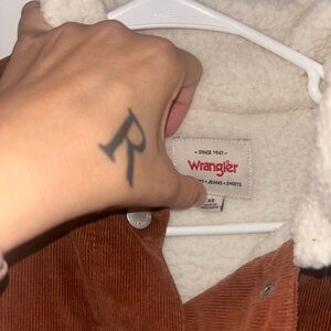 Rust corduroy jacket by Wrangler. Features a warm sherpa collar and button closure. Color is rust. Brand new condition.