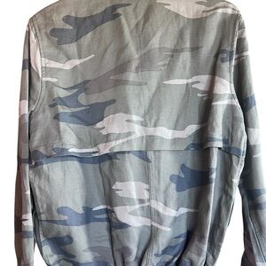 The Rails Utility Jacket showcases a stylish blend of green and gray hues, crafted from a soft, lightweight fabric ideal for everyday wear. Its design features a classic shirt-style collar and decorative epaulettes, offering a chic, utilitarian look.