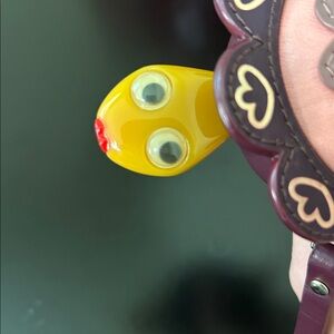 Condition: perfect with no callouts. No tears, rips, or stains to the leather exterior or fabric interior. Has the covered quick and curious storybook lining. Zipper is fully functional. There is no cracking on the zipper pull. Resin turtle head has fun googly eyes which move and head bubbles up and down.
