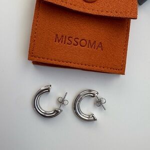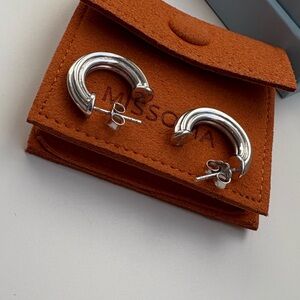 Elegant silver small hoop earrings by Missoma. Gently used, only worn 1 or 2 times. Has very tiny scratches if you zoom with magnification. Comes with box and jewelry pouch. Approx 20mm diameter / 0.75”