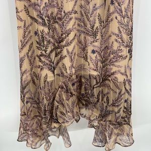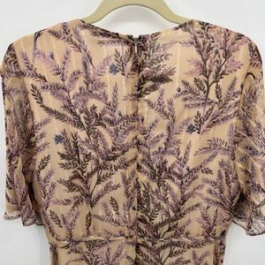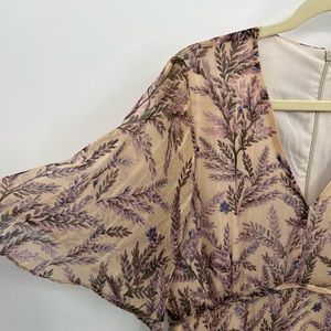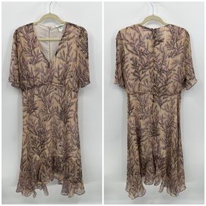 Sundance Lilac Spring midi dress. Purple floral lilac on tan background with metallic stripes.