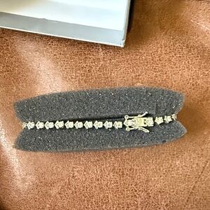Silver tennis bracelet style. I don’t know the exact name of it but I have had it for 2 years and worn it twice. It would make a great Christmas gift. It’s just not my style.