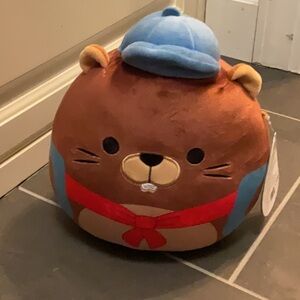 Adorable brown beaver Chip Squishmallow. Features a cute blue hat and red scarf. Perfect for cuddling. New with tags